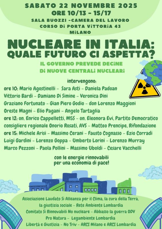 Un’alleanza tra Milano e territori, tra scienza e democrazia, tra lavoro e giustizia ambientale e sociale, tra etica ed economia di pace è il percorso che cerca di tracciare il Convegno di sabato 22 novembre 2025 “NUCLEARE IN ITALIA: QUALE FUTURO CI ASPETTA?”.