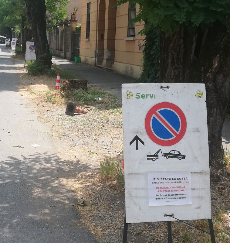Un cartello dell'AEM avvisava che “E' vietata la sosta dalle ore 7.30 alle ore 17.00 da martedì 10 giugno a giovedì 12 giugno per lavori di abbattimento e fresatura ceppaie”. E puntuali, ieri mattina, sono intervenuti gli operai con ruspa e motoseghe. Dopo poche ore, i risultati sono quelli che si possono vedere nelle foto scattate dal concittadino.