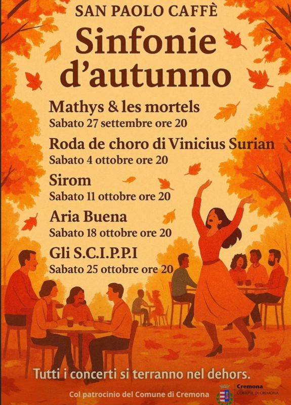 In piazza San Paolo si torna a fare musica dal vivo, dopo la pausa agostana e dopo il Summer Festival che per i primi sei weekend estivi ha animato le serate del San Paolo Caffè. In concomitanza con Cremona Musica e l'edizione autunnale delle Invasioni Botaniche, la storica attività rilancia l'ennesima stagione di eventi con "Sinfonie d'autunno": un titolo bergmaniano per la serie di 5 concerti all'aperto che ravviveranno le serate del sabato fino a fine ottobre, patrocinate e in collaborazione con il Comune di Cremona.