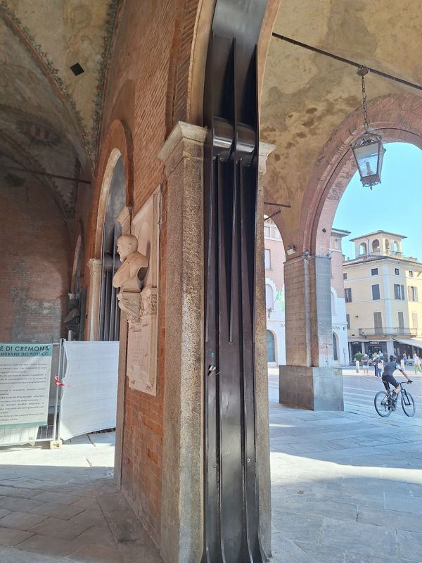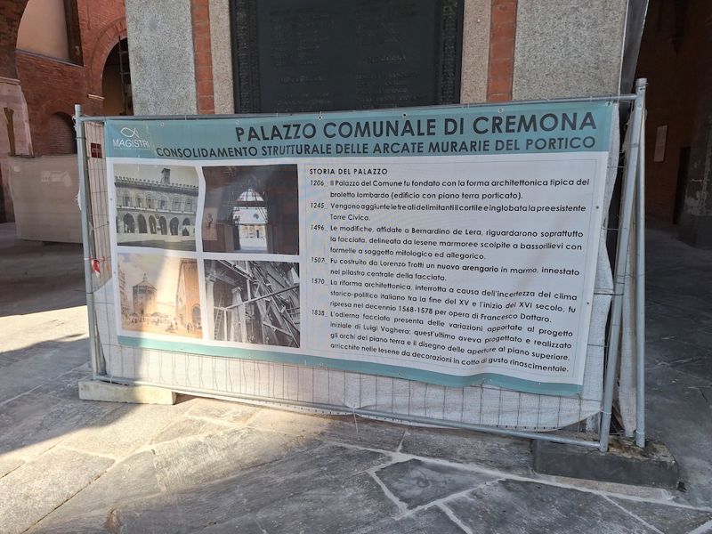 Durante l’intervento strutturale sulle murature degli archi, è stato possibile constatare lo stato di diffuso degrado in cui versavano gli affreschi situati tra gli archi e raffiguranti sia soggetti religiosi, sia simboli politici e civili. Si è così esteso l’intervento anche al restauro di questi lacerti di affresco, effettuando innanzitutto una delicata pulitura a secco seguita da pulitura con impacchi di soluzioni detergenti a base acquosa, che hanno permesso di recuperare i colori originali di questi dipinti. Anche in questo caso è stato necessario un consolidamento dei distacchi degli intonaci dalla muratura, svolto tramite iniezioni di malte apposite, seguito da stuccatura con malte a base di calce naturale e infine dall’equilibratura cromatica mediante acquarelli, che ha restituito unità di lettura a questi pregiati dipinti. Sono così tornati alla luce le raffigurazioni, nelle lunette dei tre archi sotto il portico, verso la piazza, a partire da sinistra, dell’Angelo annunciante, l’Allegoria della Giustizia e l’Annunciazione, caratterizzate da una rara raffinatezza, nonché il Leone di San Marco, a testimonianza dell’occupazione veneziana di Cremona tra il 1499 al 1509, anno in cui il re di Francia Luigi XII liberò la città, come dimostra lo stemma con i tre gigli, emblema araldico della monarchia francese, presente nella Sala degli Alabardieri”.