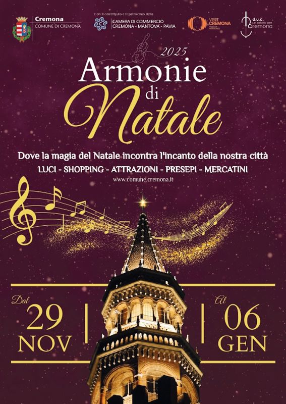 Attrazioni per bambini e famiglie, tante luci, shopping, presepi, mercatini, esibizioni di complessi bandistici e cori, sono gli elementi che caratterizzano Armonie di Natale in programma a Cremona dal 29 novembre 2025 al 6 gennaio 2026. Una proposta maturata all’interno del DUC (Distretto Urbano del Commercio, di cui il Comune è capofila) dove sono state condivise le varie iniziative volte a supportare e rilanciare il centro storico e i negozi di vicinato durante il periodo che precede e segue il Natale.