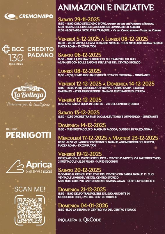 Su tutto il materiale informativo e promozionale è presente l’indirizzo della pagina dedicata del sito del Comune che ospita il calendario, in costante aggiornamento, di tutti gli eventi in programma dal 29 novembre 2025 al 6 gennaio 2026, nonché un QR Code da inquadrare con il proprio smartphone per visualizzare quando, dove e a che ora si svolgeranno i vari appuntamenti.