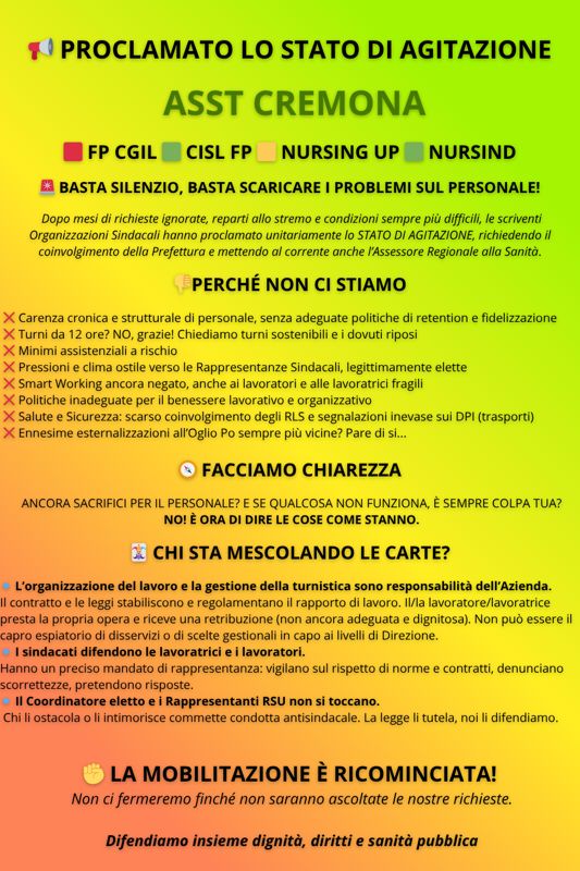 "Come Organizzazioni Sindacali Territoriali FP CGIL, CISL FP, Nursing Up e Nursind - spiegano -, abbiamo proclamato lo stato di agitazione del personale del comparto dell’ASST di Cremona in data 11 settembre 2025. È stata una decisione ponderata, assunta dopo mesi di interlocuzioni che non hanno prodotto risposte adeguate alle criticità ormai evidenti. Abbiamo trasmesso la formale comunicazione alla Prefettura di Cremona e alla Direzione Generale dell’Azienda, con informativa all’Assessorato al Welfare di Regione Lombardia, chiedendo l’attivazione della procedura di raffreddamento e conciliazione prevista dalla L. 146/1990 e dalla L. 83/2000".