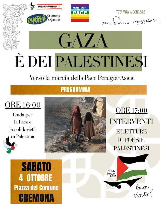 “Sabato pomeriggio 4 ottobre in piazza del Comune a Cremona – spiegano gli organizzatori – ci troveremo per affermare con ostinazione che Gaza è Palestina, Gaza è dei palestinesi”.