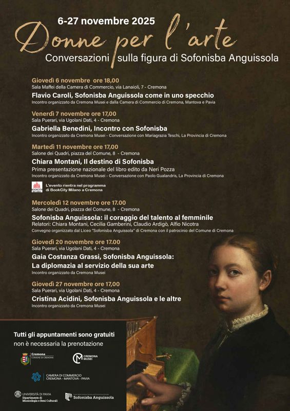 L'iniziativa Donne per l'arte - Conversazioni sulla figura di Sofonisba Anguissola si aprirà, giovedì 6 novembre, con un importante appuntamento organizzato da Cremona Musei e dalla Camera di Commercio di Cremona, Mantova e Pavia. Alle 18:00, la Sala Maffei della Camera di Commercio (via Lanaioli, 7) ospiterà lo storico dell'arte Flavio Caroli che presenterà il suo libro Come in uno specchio, edito da Rizzoli. Un diario segreto ritrovato sul luogo della sepoltura di Sofonisba Anguissola in San Giorgio dei Genovesi a Palermo a quattrocento anni dalla morte.