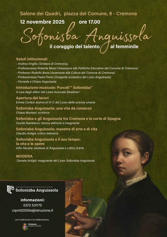 Sofonisba Anguissola: il coraggio del talento al femminile è il titolo del convegno organizzato dal Liceo "Sofonisba Anguissola" di Cremona con il patrocinio del Comune di Cremona che si terrà mercoledì 12 novembre, alle 17:00, nella Sala dei Quadri di Palazzo Comunale. I relatori delineeranno la figura dell'artista approfondendone il profilo sotto vari aspetti.