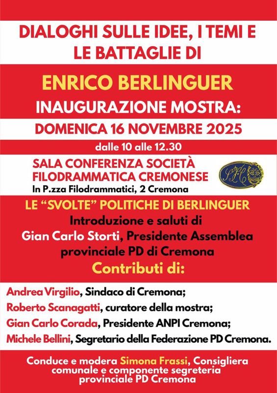 Dal 16 al 23 novembre 2025 Cremona ospita una mostra fotografica dedicata alla vita, alla carriera e al lascito morale del dirigente del Partito Comunista Italiano Enrico Berlinguer. A oltre 40 anni dalla scomparsa di Enrico Berlinguer, l'evento in programma intende realizzare un momento di riflessione politica per la conservazione e valorizzazione del patrimonio culturale della sinistra italiana e come opportunità di conoscenza, in particolare, per le giovani generazioni.