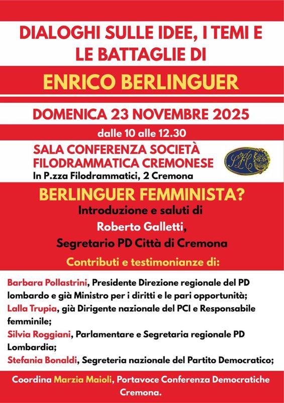 Introduzione e saluti di Roberto Galletti, Segretario PD Città di Cremona Contributi e testimonianze di: Barbara Pollastrini, Presidente Direzione regionale del PD lombardo e già Ministro per i diritti e le pari opportunità; Lalla Trupia, già Dirigente nazionale del PCI e Responsabile femminile; Silvia Roggiani, Parlamentare e Segretaria regionale PD; Stefania Bonaldi, Segreteria nazionale del Partito Democratico.