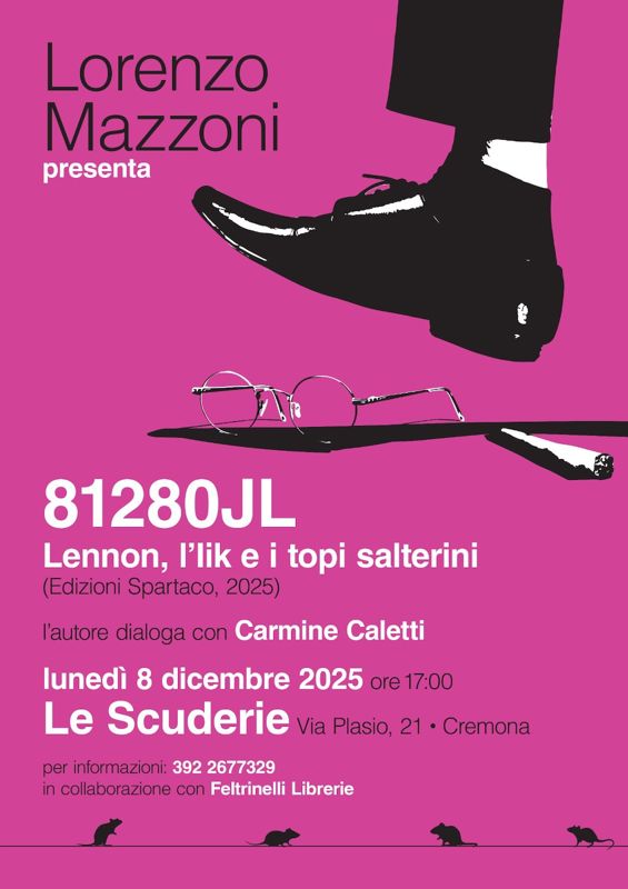 81280JL. Lennon, l'Iik e i topi salterini: questo il titolo del nuovo romanzo di Lorenzo Mazzoni, pubblicato da Edizioni Spartaco nel 2025, che sarà presentato a Cremona nel pomeriggio festivo di lunedì 8 dicembre, alle ore 17:00, in un luogo ritrovato per la città: Le Scuderie di Via Plasio, 21.